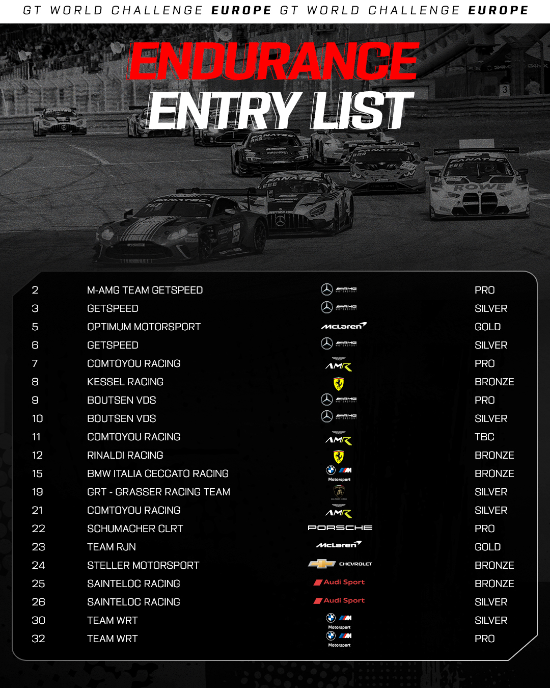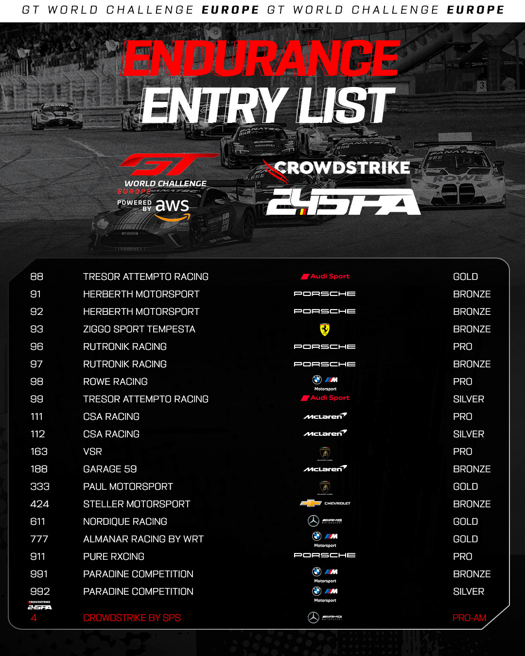 The 2025 GT World Challenge Europe powered by AWS grid is noticeably well-balanced across the Pro, Gold Cup, Silver Cup, and Bronze Cup classes. As such, fans can expect to see close-fought battles at every level throughout the twice-around-the-clock contest.