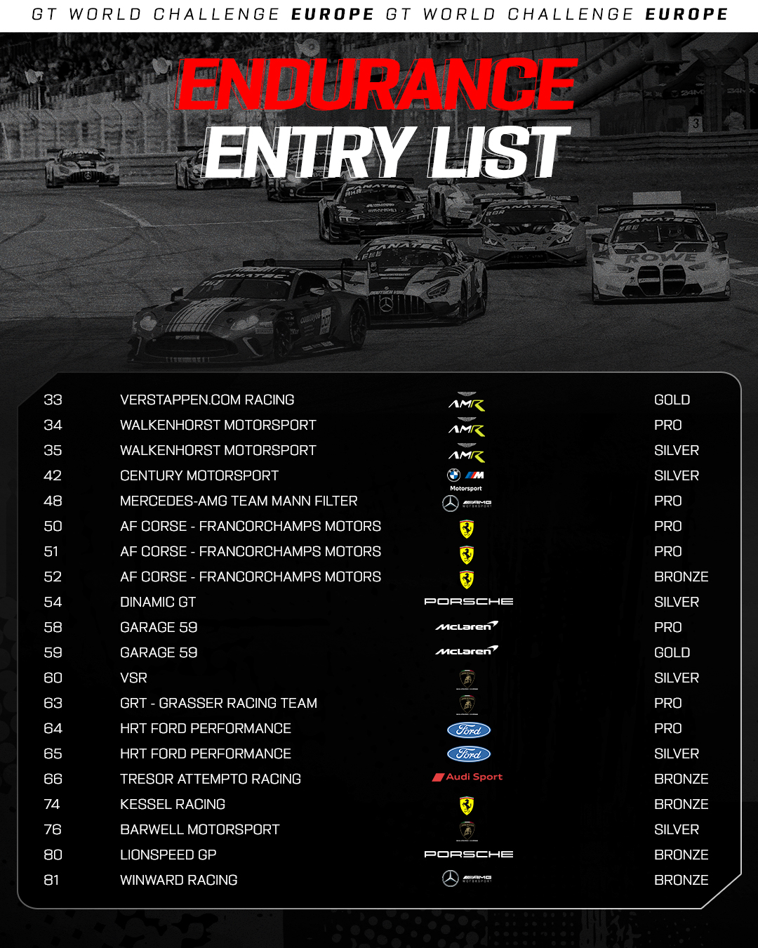 For the season's marquee event, Belgian teams will once again be well represented. In addition to defending champion Comtoyou Racing (Aston Martin), the local favourites include Team WRT (BMW) and Boutsen VDS (Mercedes-AMG). They will face competition from Verstappen.com Racing (Aston Martin), the team established by the four-time Formula 1 World Champion, which will make its maiden appearance at the Ardennes event this summer.
